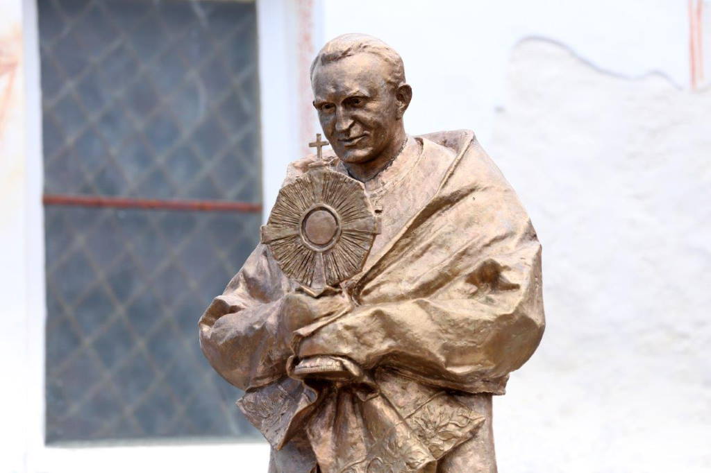 Brončani spomenik kardinala Franje Kuharića, visok 2,2 metra, rad je akademskog kipara Tomislava Kršnjavog.